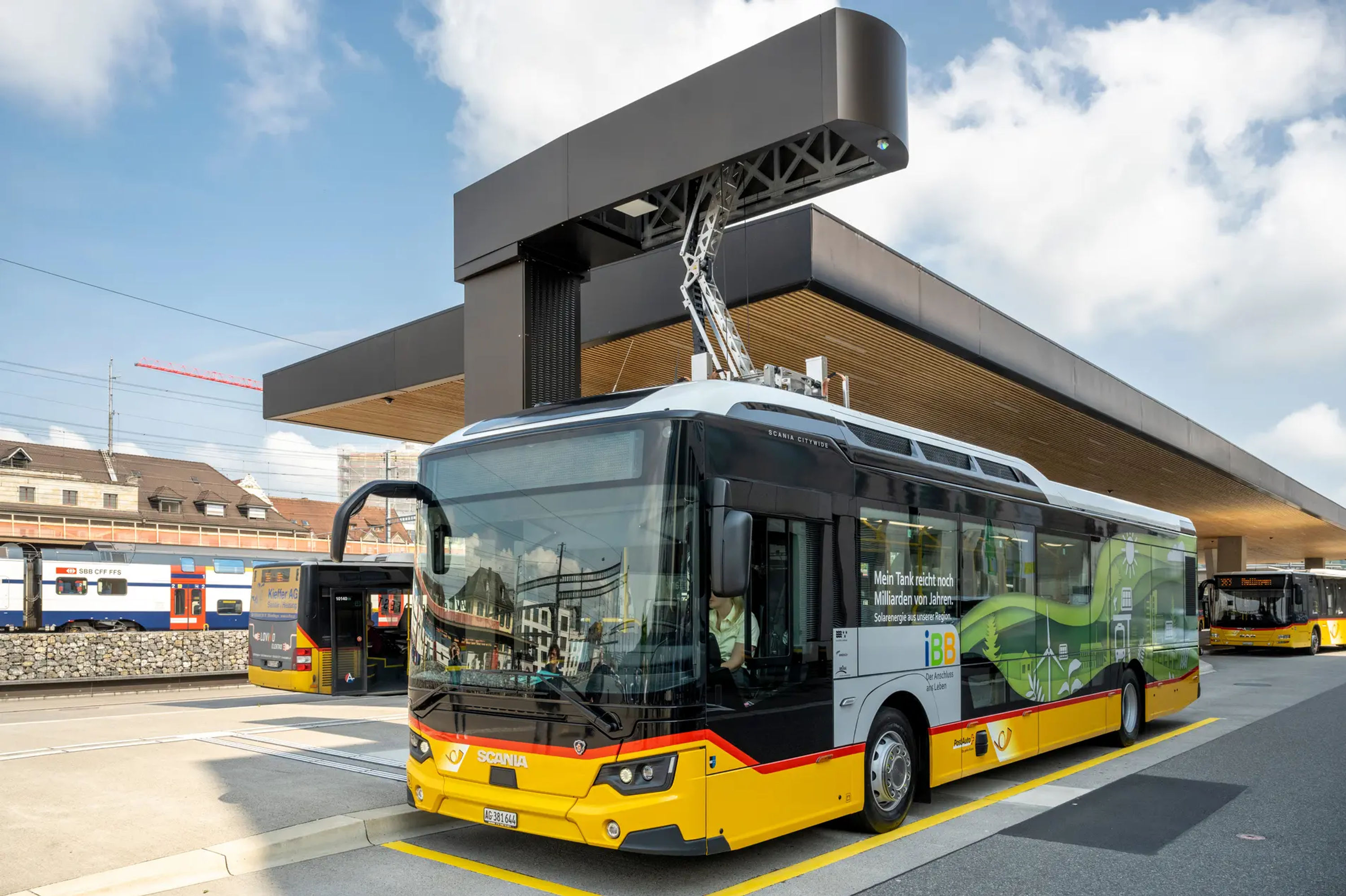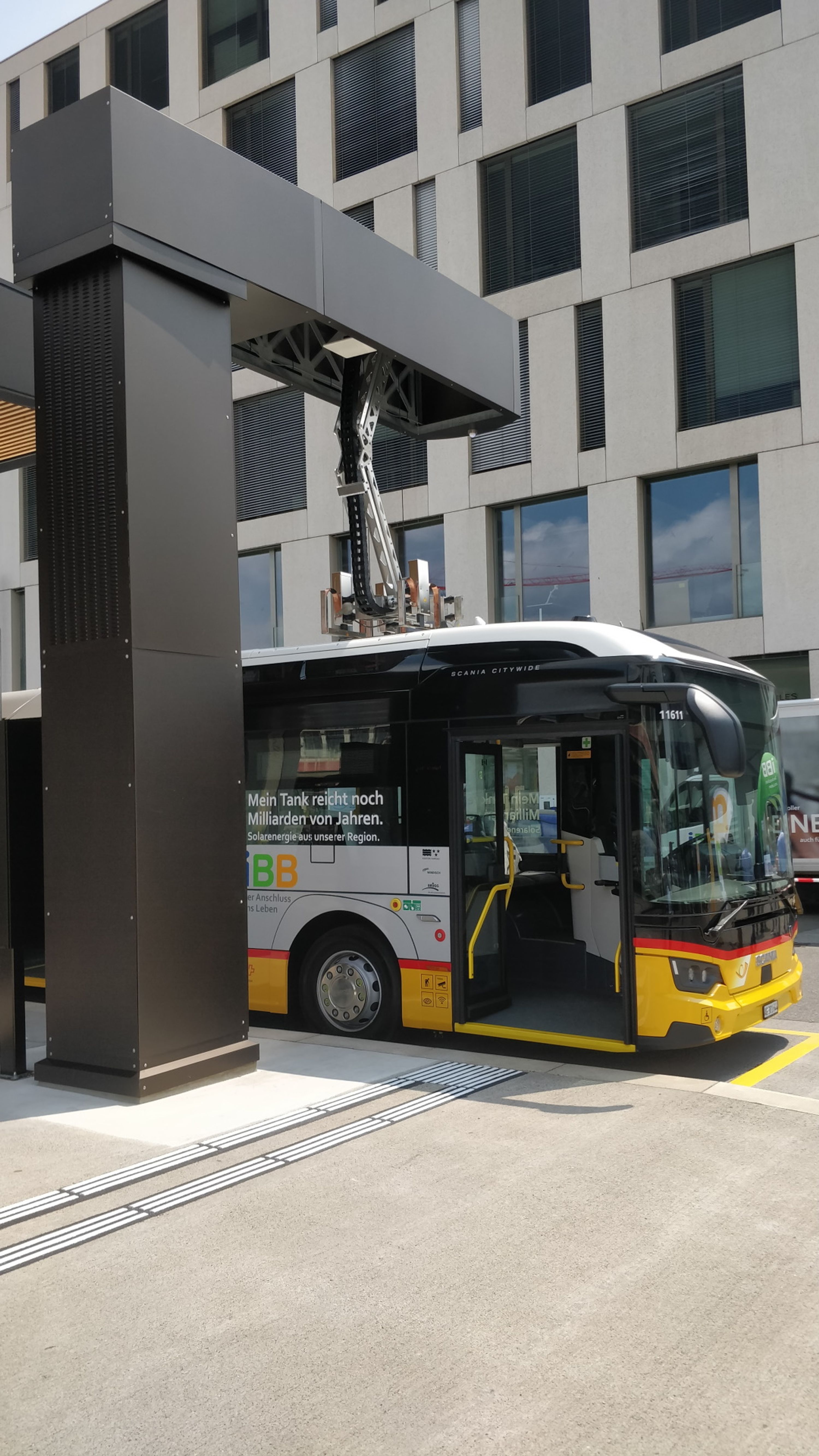 Im Bezirk Brugg nahm 2022 das erste batteriebetriebene Postauto der Nordwestschweiz seinen Betrieb auf. Um den Bus während der Standzeit am Bahnhof Brugg aufzuladen, wurde eine Ladestation mit einem Pantografen erstellt.